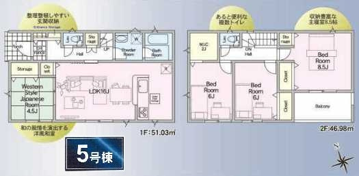 LDK 16.0帖 1室/和室 5.2帖 1室/洋室 8.5帖 1室/洋室 6.0帖 2室 - 向き